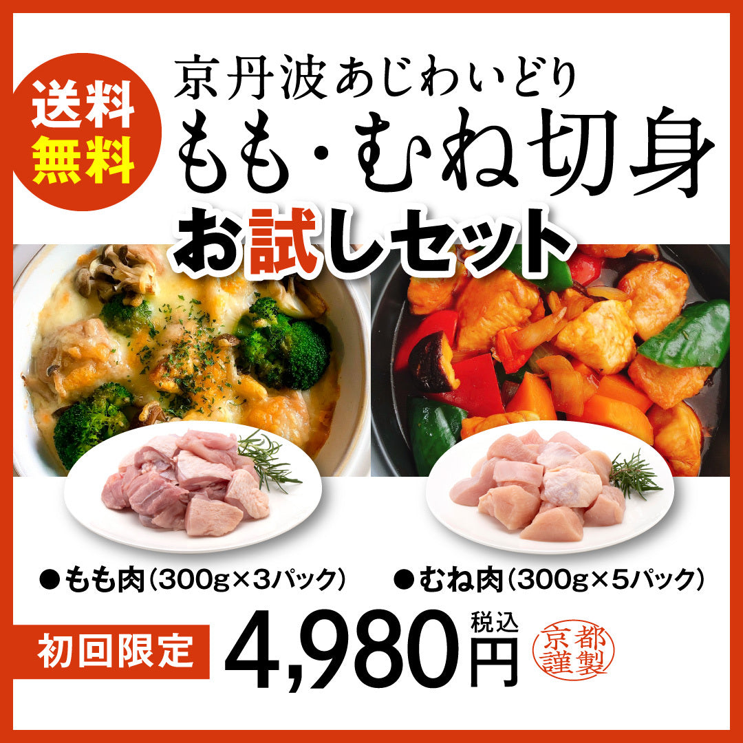 【初回送料無料】京丹波あじわいどりお試しセット(切身(もも300gX2、むね300gX2、唐揚げ500g×3パック)