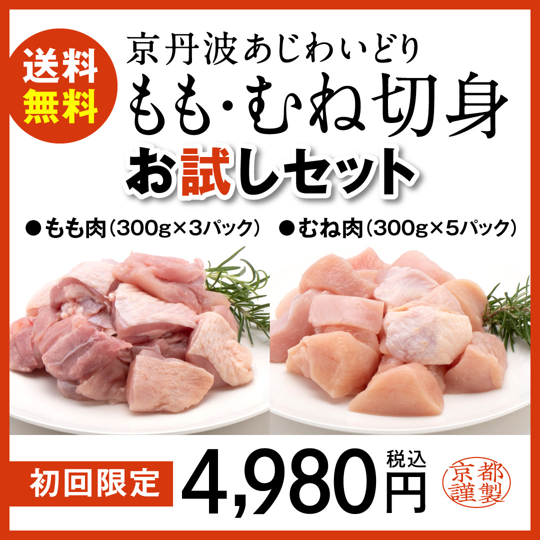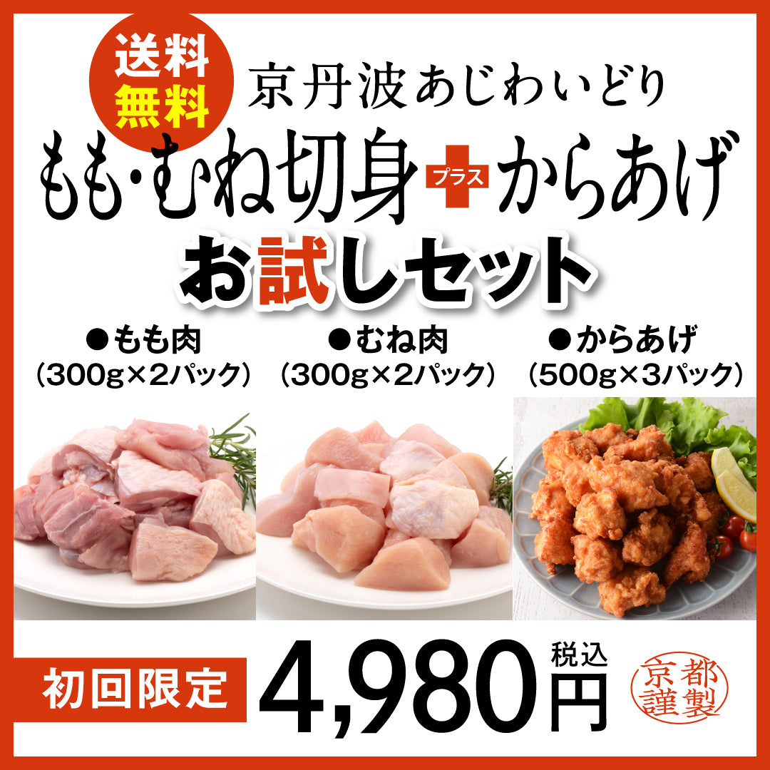 【初回送料無料】京丹波あじわいどりお試しセット(切身(もも300gX2、むね300gX2、唐揚げ500g×3パック)